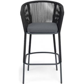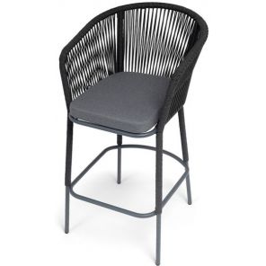 Барный стул «Марсель» представлен в стальном каркасе темно-серого (RAL7024) цвета, оплетен вручную эластичными синтетическими лентами из высокопрочных полиэфирных волокон, темно-серого оттенка, размер стула: 590×705×1070 мм.
