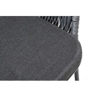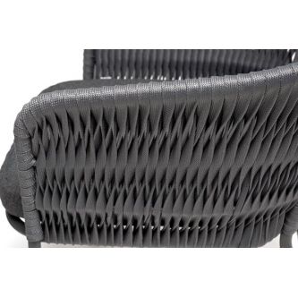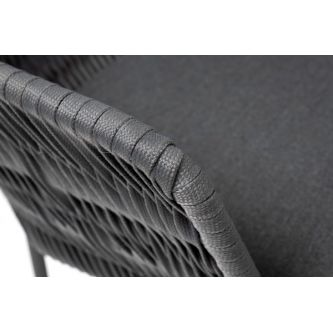 Вместе с этим, в комплектацию входит 4 плетеных стула «Бордо», выполненных с использованием высокопрочного роуп-волокна серого цвета с плетением вида «колос». Стулья имеют размеры 570×620×775 мм и устойчивый каркас из алюминия, окрашенной порошковой краской темно-серого цвета.