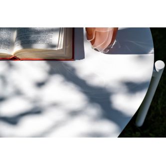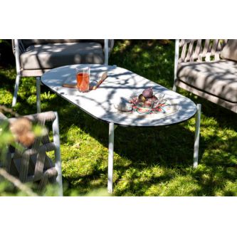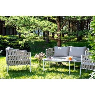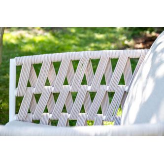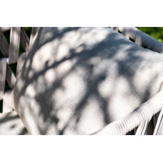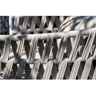 Каркас уличной мебели выполнен из износостойкого алюминия. Его дополняет бежевая ручная оплетка, изготовленная на основе эластичных синтетических лент из полиэфирных волокон высокой прочности (роупа).