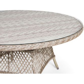В качестве основания выступает каркас, выполненный из алюминия и оплетён круглым искусственным ротангом бежевого цвета. Рабочую плоскость покрывает 5 мм столешница из ударопрочного закаленного стекла.