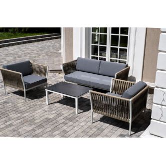 Диван и кресла изготовлены их алюминиевого прочного каркаса, оплетенного ручным способом роупом серо-коричневого цвета. Это эластичные ленты из полиэфирных волокон высокого качества.