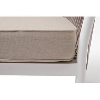 Кресло имеет алюминиевый каркас, окрашенный порошковой краской белового цвет. Боковины каркаса вручную оплетены роупом - эластичными синтетическими лентами, изготовленными из высокопрочных полиэфирных волокон. Цвет оплетки - бежевый.