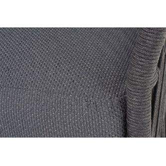 Диван имеет алюминиевый каркас, окрашенный порошковой краской в темно-серый цвет. Боковины каркаса и спинка вручную оплетены роупом - эластичными синтетическими лентами, изготовленными из высокопрочных полиэфирных волокон. Цвет оплетки в тон каркасу - темно-серый.