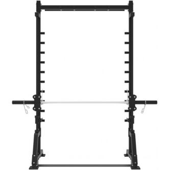 Модель рассчитана на максимальный вес пользователя до 120 кг. Тренажёр оснащён грифом для приседаний, который перемещается по направляющим и фиксируется с помощью ограничительных кронштейнов безопасности, расположенных сверху вниз по всей высоте конструкции. Для надёжной фиксации весовых блинов предусмотрен пружинный зажим.