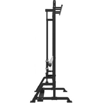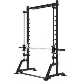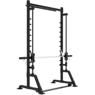 Машина Смита представляет собой силовой тренажёр с массивной стальной рамой чёрного цвета, предназначенный для безопасных и эффективных тренировок. Конструкция выполнена в виде устойчивой прямоугольной рамы с двумя основными вертикальными направляющими, по которым движется гриф, и множеством уровней фиксации по всей высоте стоек, что позволяет устанавливать стартовое и конечное положение штанги на разных уровнях.