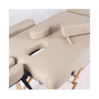 Массажный стол оснащен большой полукруглой фронтальной подлокотной полкой, классическим фронтальным подлокотником, а также двумя съемными боковыми подлокотниками, что повышает комфорт клиента и расширяет возможности использования стола при различных техниках массажа.