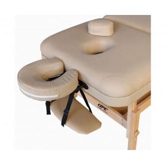 В комплект входит съемный подголовник с регулировкой высоты. Он легко настраивается под рост клиента и тип массажа. Также предусмотрен люверс для лица с заглушкой, что делает стол удобным для классического массажа в положении лежа.