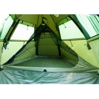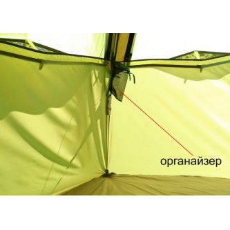 Боковые стенки палатки снабжены четырьмя большими окнами с встроенными противомоскитными сетками. На дугах палатки закреплены два органайзера (карман из сетки) для мелких предметов. Под потолком крепится полочка для просушивания вещей. Спальная капсула создает условия комфортного проживания в палатке во время ночевок или длительного отдыха на природе. Капсула формирует двух/трехместное внутреннее спальное пространство, надежно защищенное от влаги и от насекомых. Капсула занимает только половину жилой площади палатки, при этом не перекрывая доступ к окнам для круговой вентиляции укрытия. Дно капсулы выполнено в виде влагостойкого корыта.