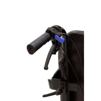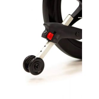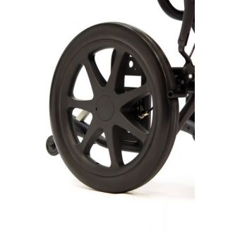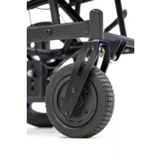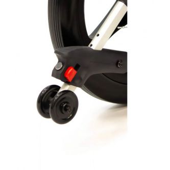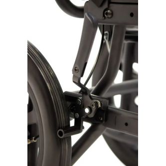 Надежные литые колеса сзади твердо держат дорогу, обеспечивая стабильность и грузовую прочность. Мягкие пневматические колеса спереди чутко сглаживают кочки и повороты, отвечая за комфорт и легкость управления. Во время остановки коляска надежно фиксируется боковыми стояночными тормозами. На ручках для сопровождающего предусмотрено дополнительное управление тормозами. Модель имеет антиопрокидыватели для еще большей устойчивости.