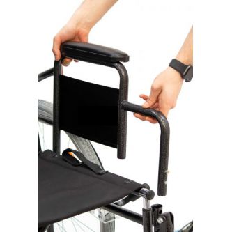 Сиденье и спинка и покрыты износостойкой тканью для комфортной эксплуатации. Коляска оснащена пневматическими колёсами, обеспечивающими плавность хода. Для безопасной стоянки предусмотрены надёжные боковые тормоза, а дублирующая система торможения на рукоятках позволяет сопровождающему быстро остановить коляску при необходимости.