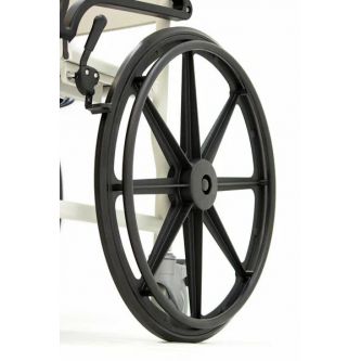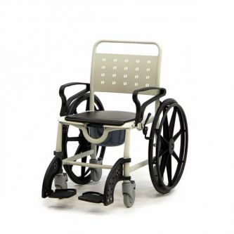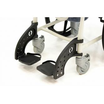 Кресло-коляска имеет 4 маленьких и 2 больших задних съемных колеса. Большие колёса позволяют пользователю передвигаться на стуле без посторонней помощи. Тормоза на каждом колесе позволяют зафиксировать кресло на месте, если это необходимо. Подножки кресла-туалета можно снять.