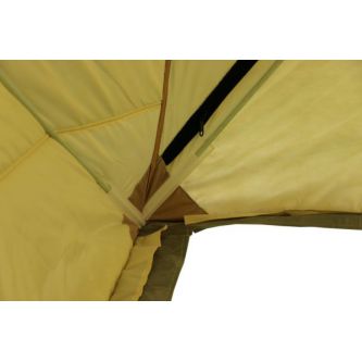 Стены палатки изготовлены из двух слоев водоотталкивающей ткани Oxford 240D с полиуретановым покрытием, между которыми находится толстый слой утеплителя, синтепона плотностью 150г/м2. Светлые ткани, используемые на внутренней части стен, обеспечивают отличную видимость внутри палатки, даже без открытия шторок на окнах. Каркас изготовлен из надежных пластиковых хабов и стеклокомпозитных материалов собственного производства, обладающих повышенной прочностью и жесткостью, благодаря чему палатке не страшен самый сильный ветер.