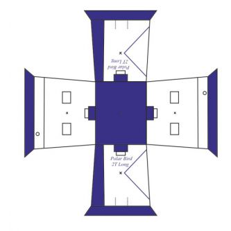 Палатка оснащена: двумя входами, четырьмя вентиляционными окнами со съемными прозрачными клапанами, которыми можно регулировать поток поступающего воздуха в палатку, четырьмя смотровыми окнами, двумя клапанами притока свежего воздуха; двумя сетчатыми полками на потолке и двумя сетчатыми карманами на стенах палатки, в которые очень удобно складывать снаряжение.
