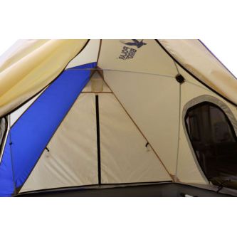 Палатку можно использовать в тандеме с плотом, для этого внешняя юбка палатки оснащена крючками для крепления к привальному брусу плота. В палатку можно установить пол ЭВА (доп опция), специально для его установки и предотвращения поддувания, палатка снабжена внутренней юбкой.