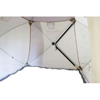 Эффективная вентиляция представлена отстегивающимися клапанами и прозрачными клапанами на окнах, при помощи которых можно регулировать и настраивать мощность притока свежего воздуха. В качества утеплителя в этой палатке используется синтепон плотностью 150 г/м², который благодаря несквозной термостяжке с крупными ячейками, более пышный. А следовательно, намного лучше сохраняет и удерживает тепло.